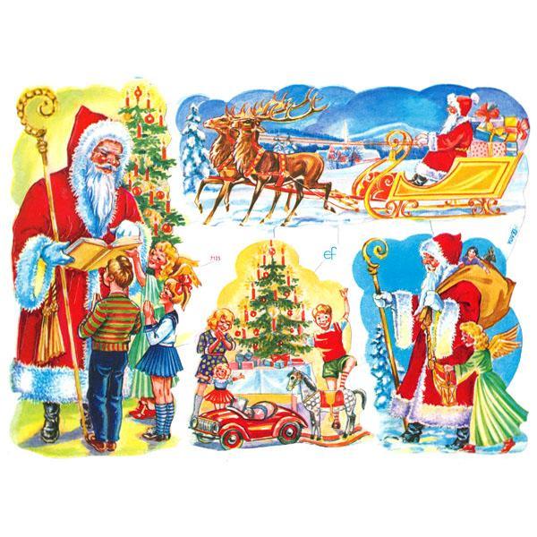 Glanzbild/Poesiebild Weihnachtsmann, Kinder, Schlitten, Geschenke