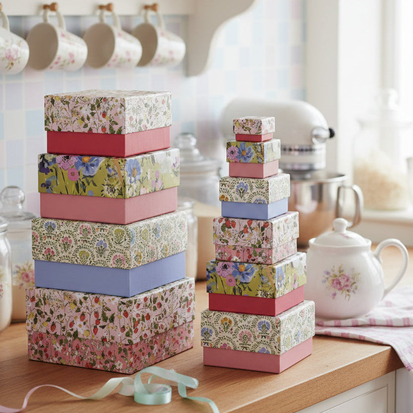 Die Geschenkboxen sind mit Erdbeeren, Blumen und eleganten floralen Mustern bedruckt
