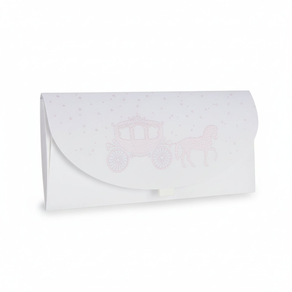 Besonderheiten: Edles Motiv Hochzeitskutsche glitzernd, inklusive passend gestalteten Einleger und Klettverschluss, innen mit zarten rosa Tupfen