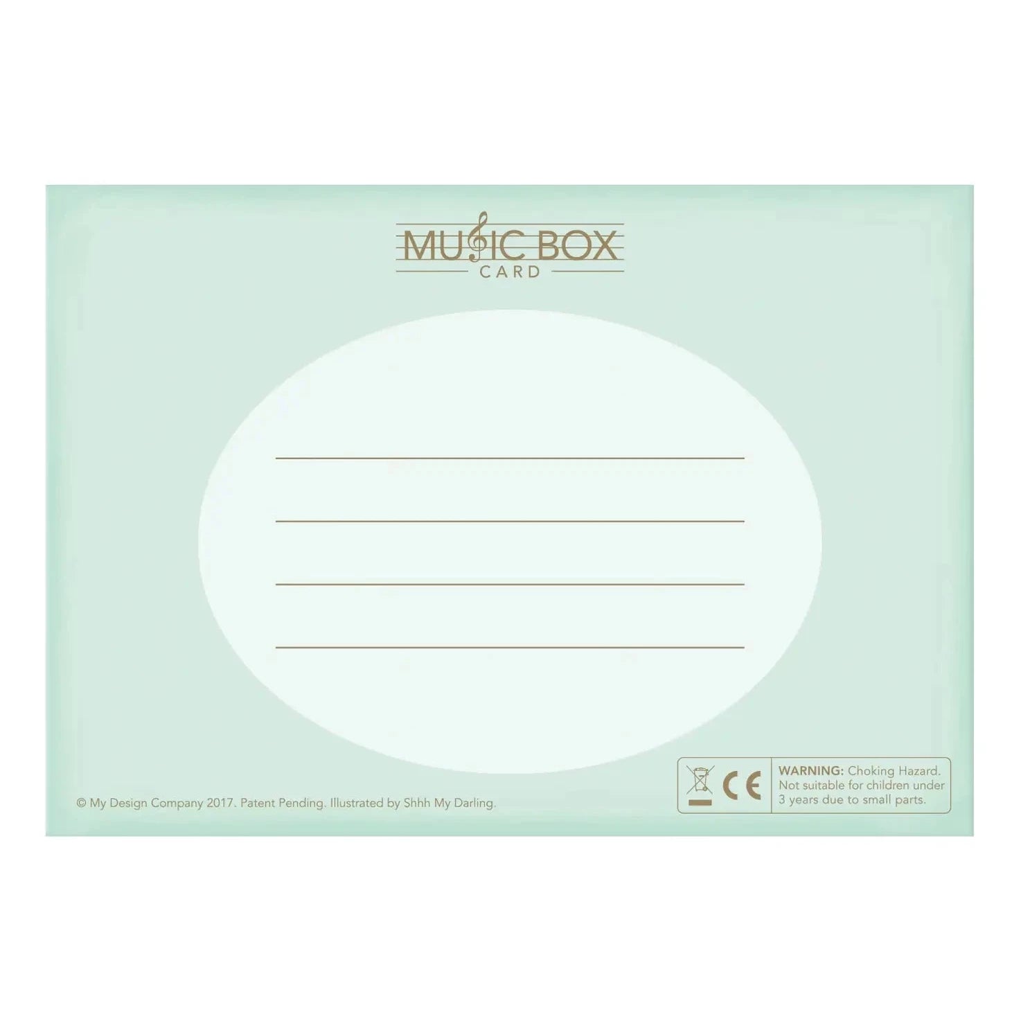 Die Vorderseite der Spieluhrkarte sieht aus wie eine herkömmliche Karte, aber wenn man sie öffnet, kommt eine magnetische Tanzfigur zum Vorschein, die sich im Takt der Musik um die Karte bewegt, wenn man auf "Play" drückt.
