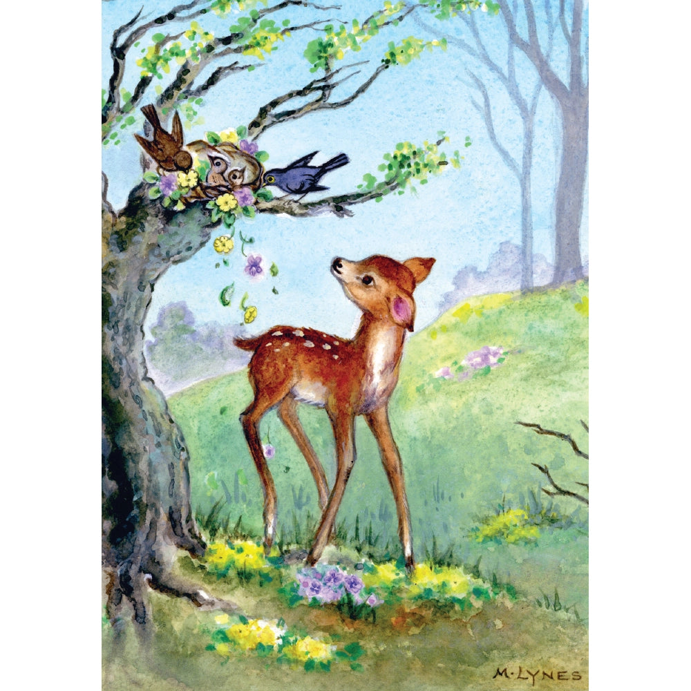 Postkarte Rehkitz schaut Vögel an