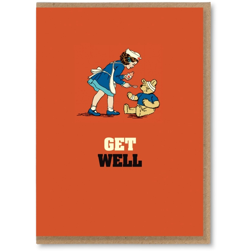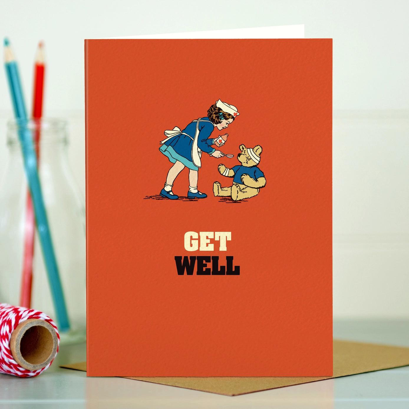 Eine hübsche Karte im Vintage-Stil mit Kinder-Krankenschwester und Teddybär für gute Besserung...