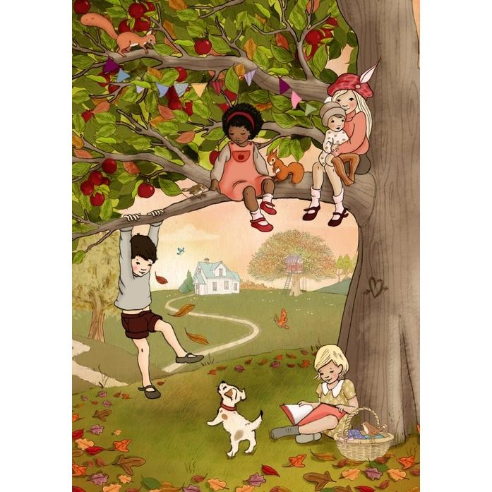 Postcard Country children sitting on a tree in autumn... Orchard Afternoon