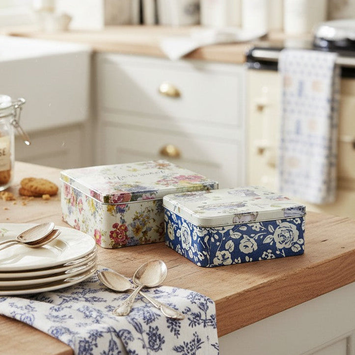 A tin box with beautiful flowers and baking utensils, ideal for your treats or for storage.