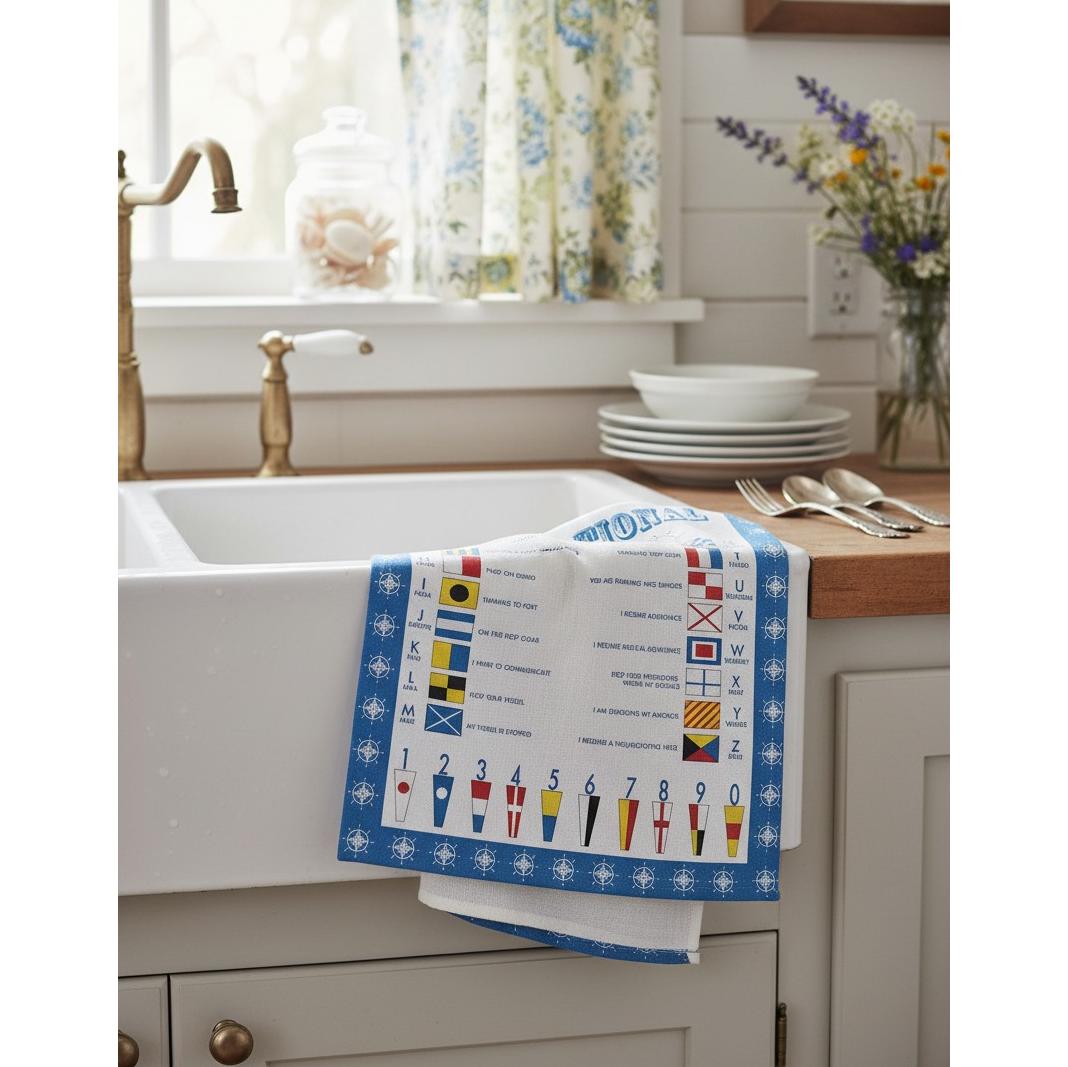 This tea towel is a perfect gift for anyone interested in sailing. It features many different flags and codes on a navy blue background.