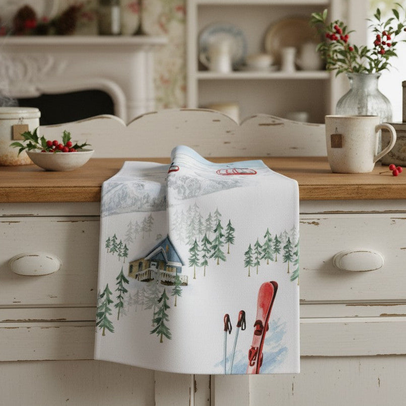 "Snowy Holidays" tea towel - skier, winter sports, cabin, slope, gondola