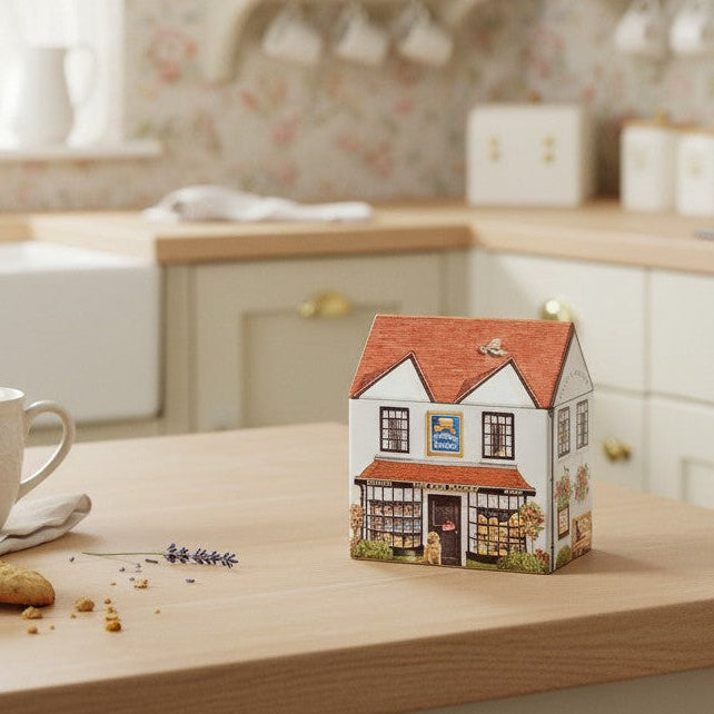 Charming house-shaped tin for storing treasures, sweets, small gifts, tea and much more