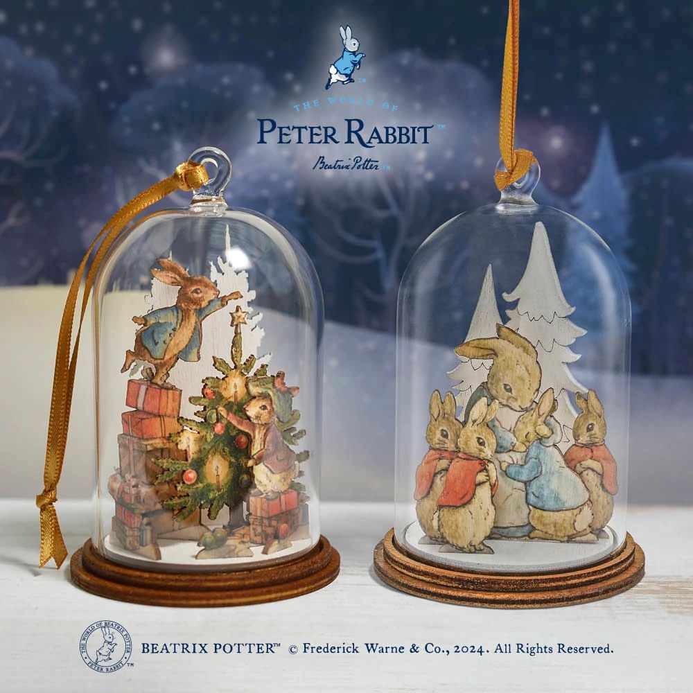 This festive wooden hanging ornament featuring Peter Rabbit and Benjamin Bunny has been elaborately designed and is presented in a beautiful glass dome.