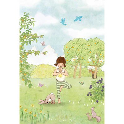 Yoga in the garden with Belle and her rabbit friend Boo. A very colorful card with flowers and Belle in tree pose.