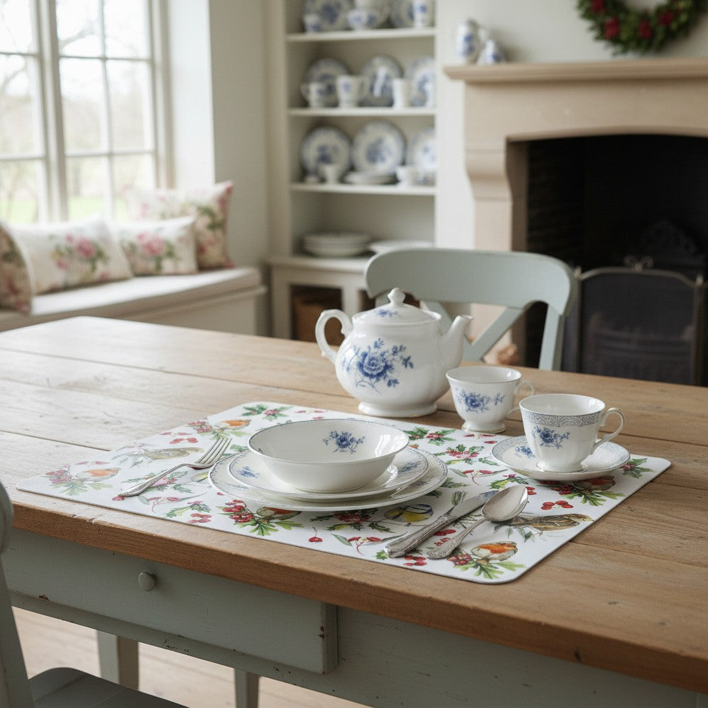 Placemat/mat for many occasions in a charming design with lavender "Birds in Winter"