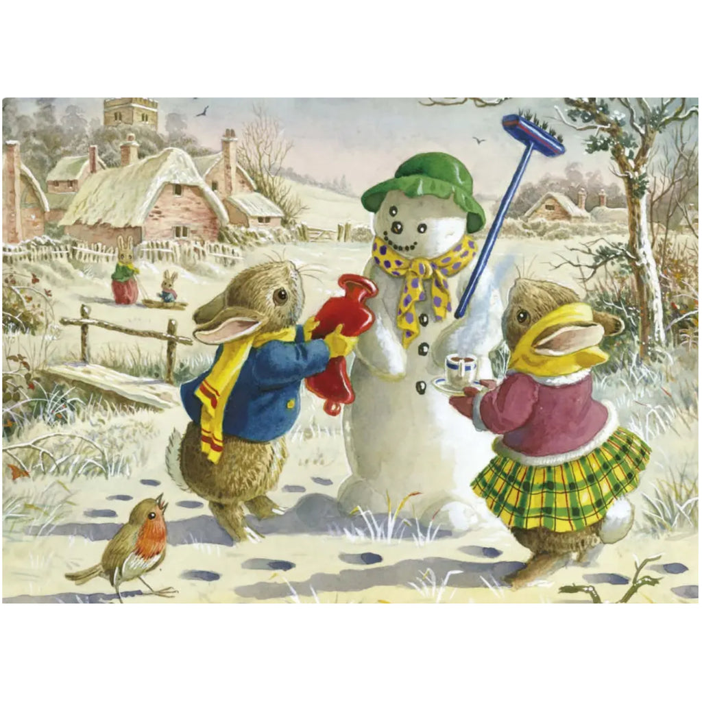 Greeting card with snowman and rabbits