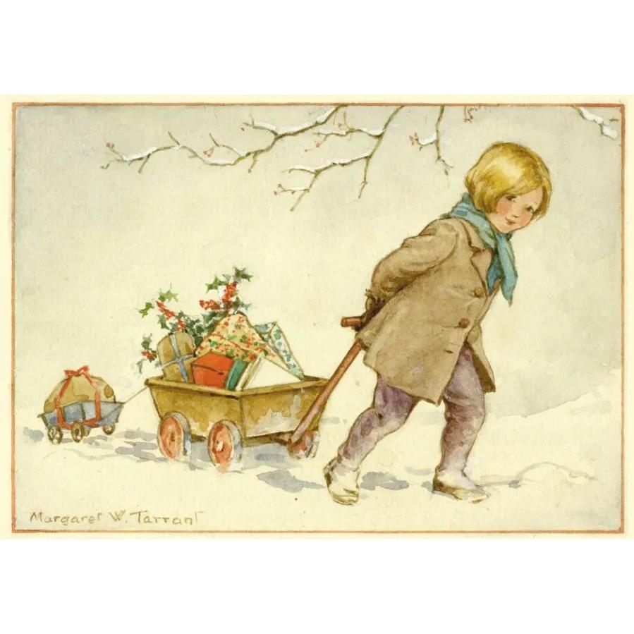 Postcard of a child with Christmas presents