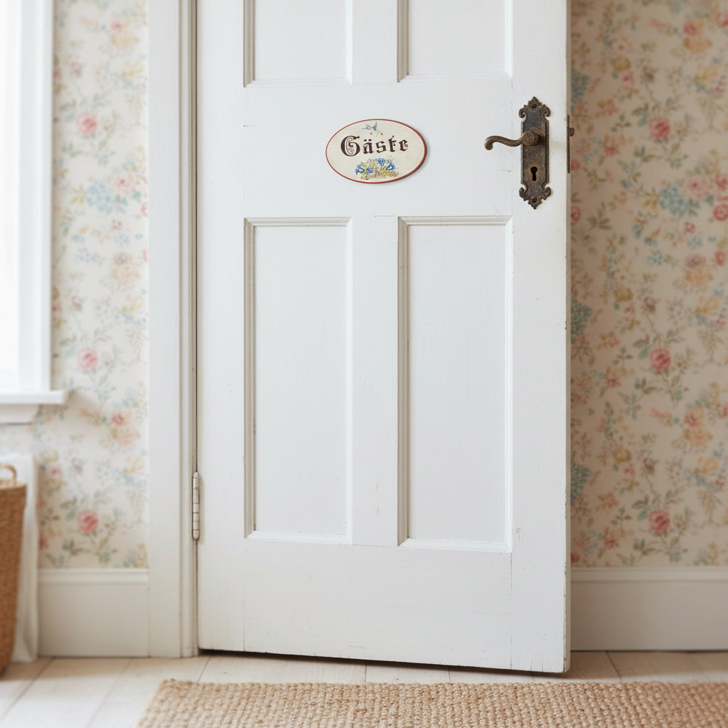 the oval door sign in country house style shows alpine flowers