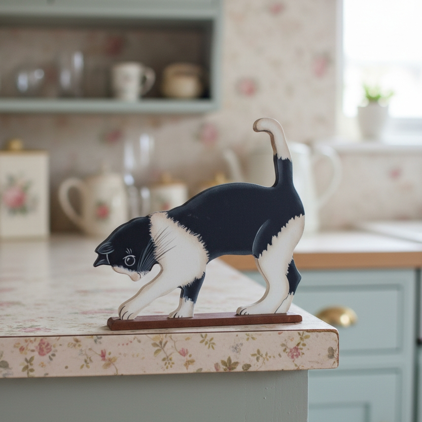 Decorative figurine of a black and white kitten playing