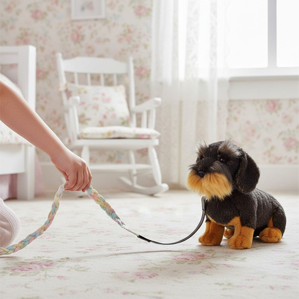 Stuffed wire-haired dachshund with collar and leash