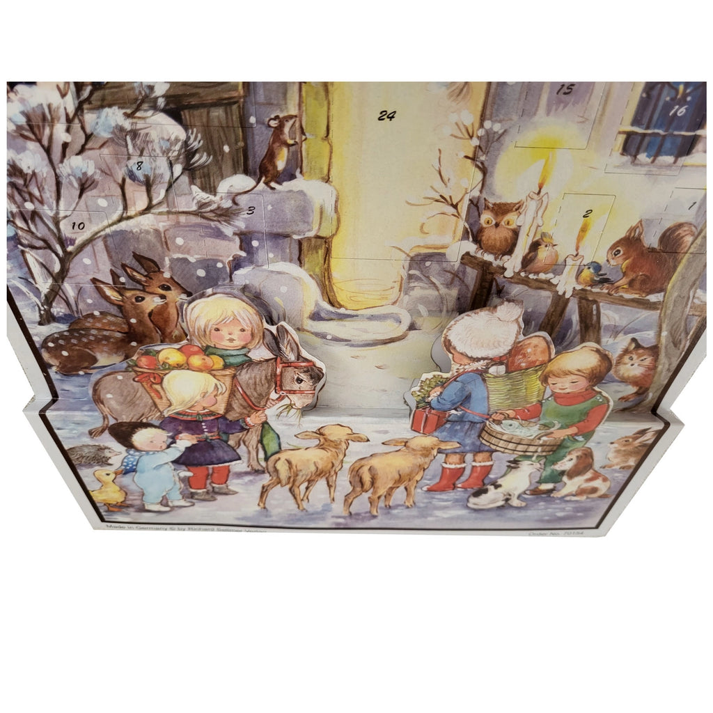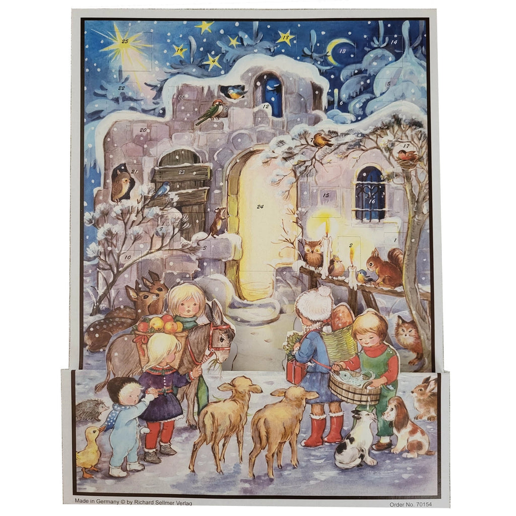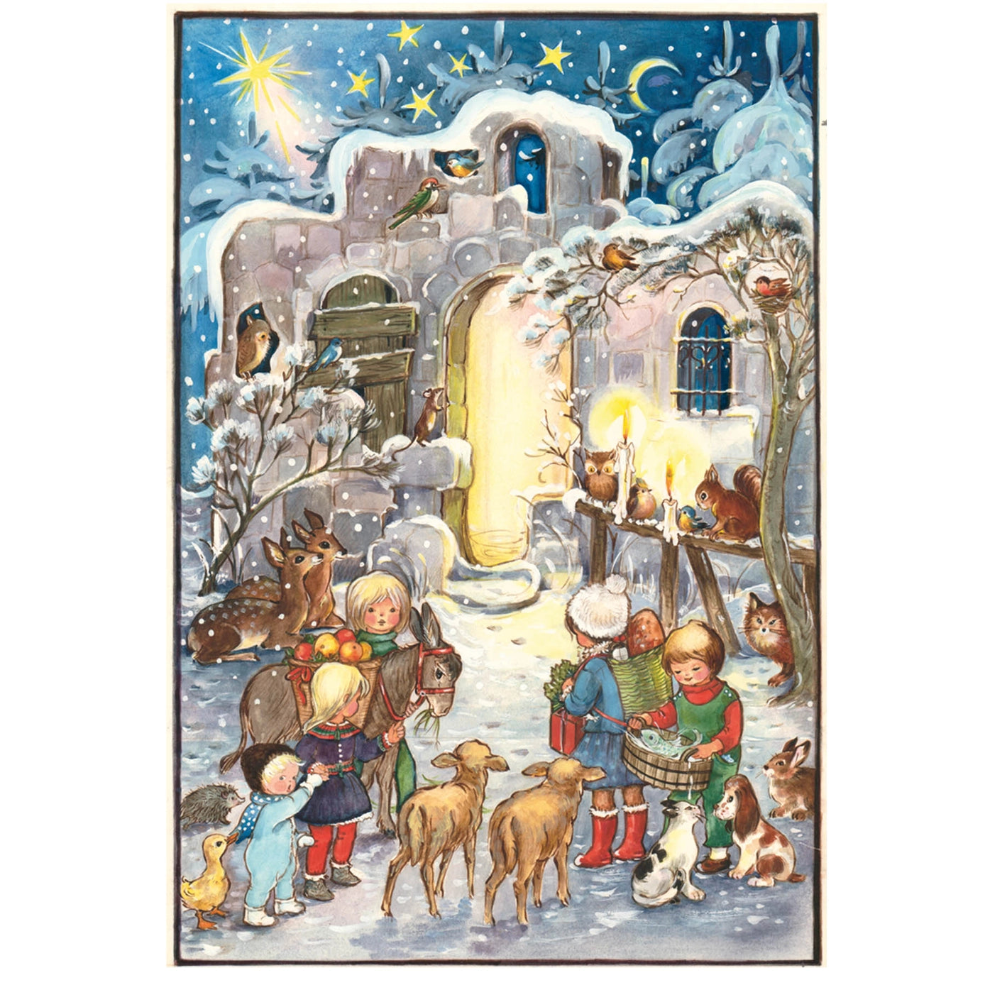 Entdecken Sie jeden Tag ein neues Türchen mit niedlichen Tieren in einem verschneiten Stall und erleben Sie die spannende Weihnachtsgeschichte.