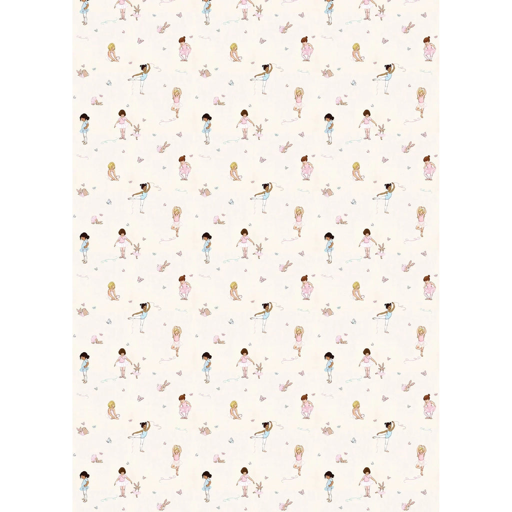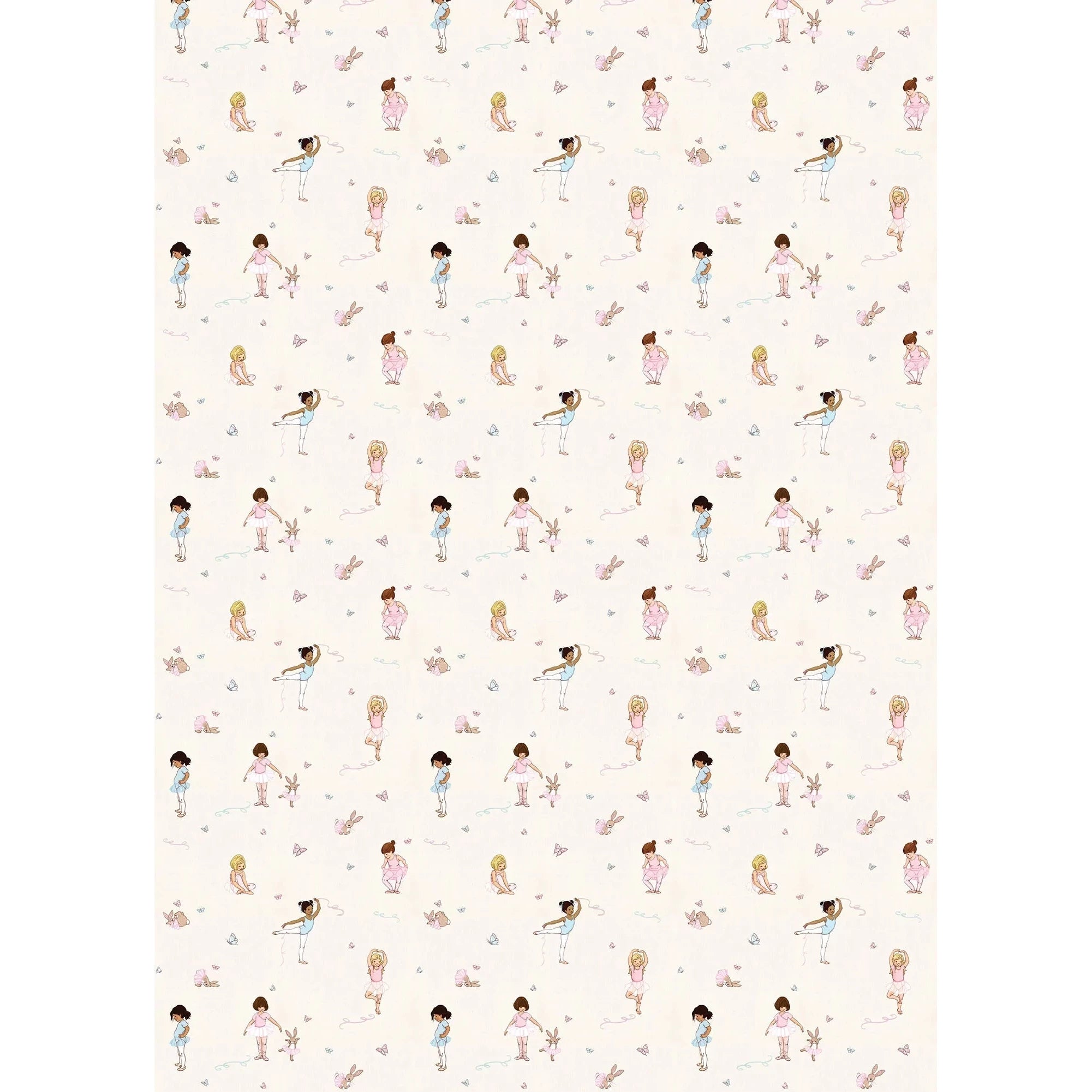 Hübsches Geschenkpapier zum Thema Ballett mit Illustrationen von kleinen Mädchen und Häschen, die zwischen Schmetterlingen tanzen. Hübsch zum Einpacken von Geschenken für den Geburtstag einer Ballerina.