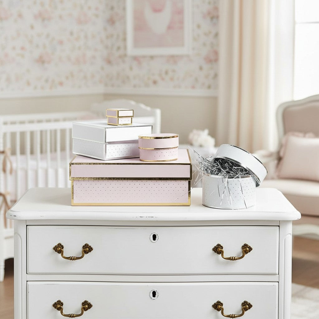 eine rosa Geschenkbox mit goldfarbenen Akzenten