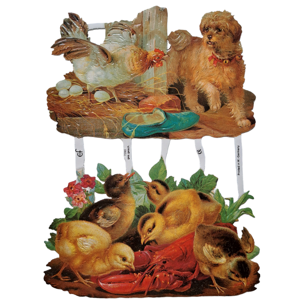 Glanzbild/Poesiebild Hund Hühner Küken Eier