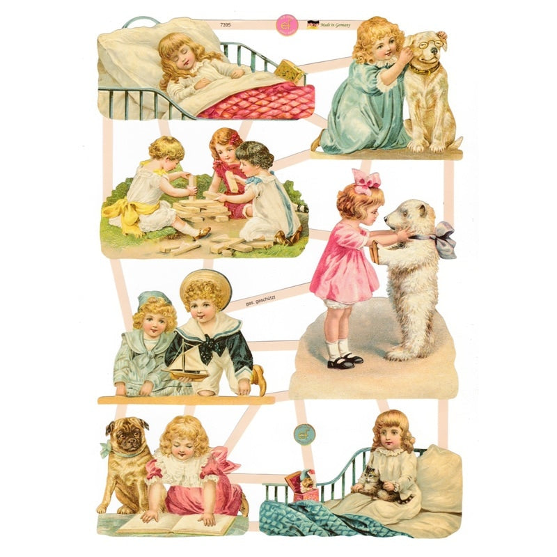 Glanzbild/Poesiebild Kinder spielend schlafend Hund Mops Eisbär Teddy