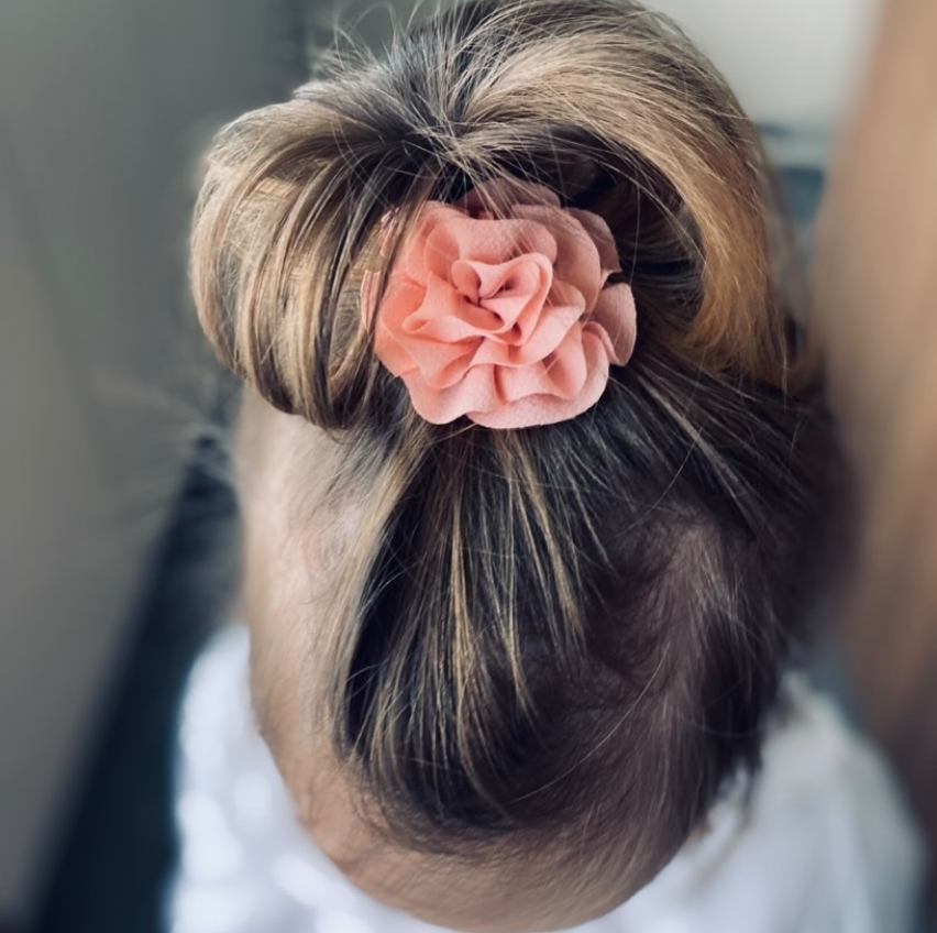 Süß für eine Haarsträhne, mit einem Pferdeschwanz oder am unteren Ende eines Haarzopfs. Sie sind etwa 5,5 cm im Durchmesser und sitzen auf einer 3,5 cm Krokodilklemme.